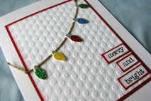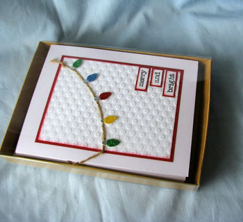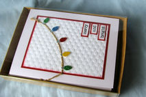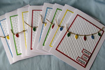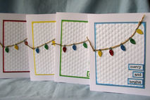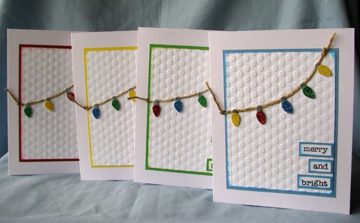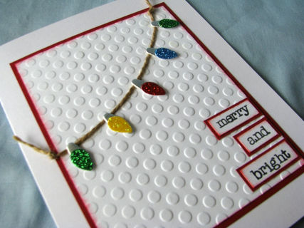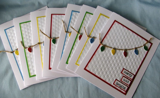 This pack of 8 embossed holiday cards can be used for many of the winter holidays. The front of these 5X6.5" cards feature a panel of white cardstock that is embossed with dots. The panel is matted on red, yellow, green or blue cardstock. The set includes two of each color. The panel then has a "strand" of Christmas lights strung across it. the words "Merry and Bright" are hand stamped and matted in matching cardstock before being adhered to the lower right edge of the embossed panel.