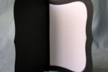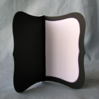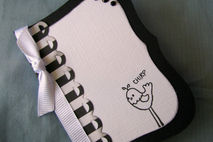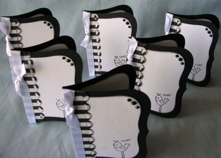 these cards are made with a specially shaped die cut then scored and folded to get their unique shape. The front of the card is then layered with a matching shaped white cardstock piece that is stamped with a birdie (with the word chirp) and inked around the edges. The card is then layered with a striped piece of black and white paper that is punched with a scalloped edge. The card front is finished off with ribbon and three black rhinestones.
