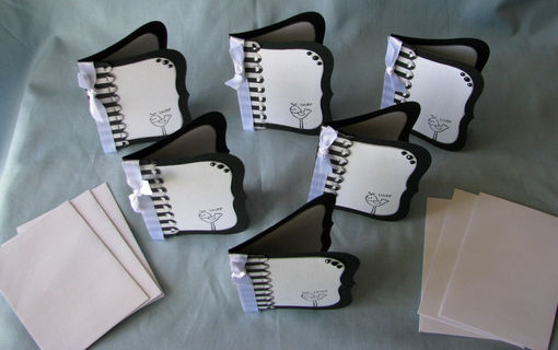The set includes 6 specially shaped mini cards and 6 white envelopes. The white envelopes measure 4 X 2 3/4". **PLEASE NOTE** Do to the knot in the ribbon, the card will make the envelope a bit harder to close so the adhesive on the envelope may not be strong enough. You may need to use a tiny piece of tape to help keep it closed.