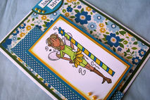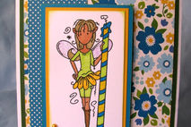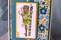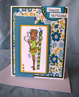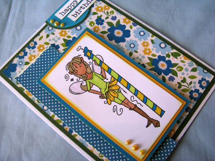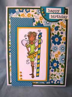 What little girl doesn't love fairies? The birthday fairy on this card is a digital stamp by Bugaboo Stamps and is hand colored by me. The card front is layered with several different papers and cardstocks and is embellished with some yellow pearls. The simple sentiment "happy birthday" is hand stamped. The fairy's wings have glitter added to them to make them sparkle like all fairies should.