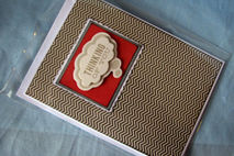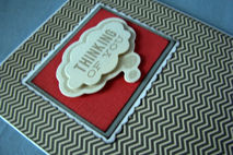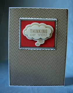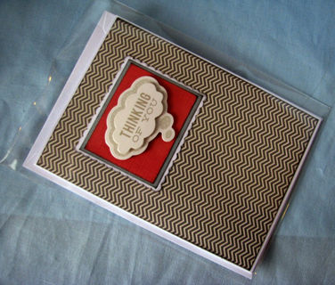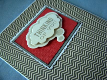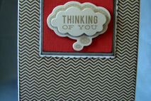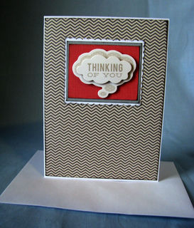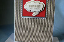The front is layered with grey chevron patterned paper and topped with a 3D thought bubble that has been triple matted on white, grey and salmon colored cardstock. The though bubble has the sentiment "Thinking of You".