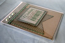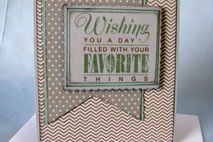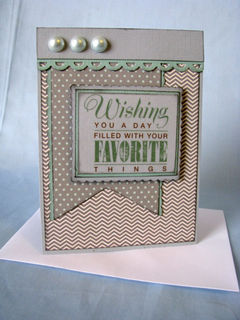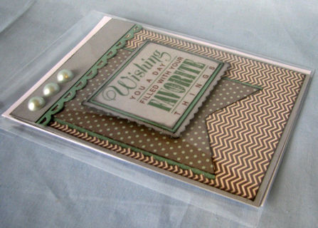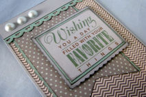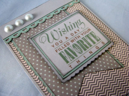 The card is layered with chevron and polka dot papers as well as mint and grey cardstock. The card is embellished with large pearls and a vellum sticker that reads "Wishing you a day filled with your favorite things".