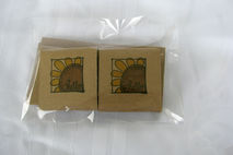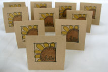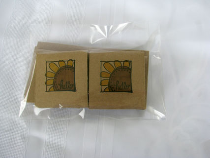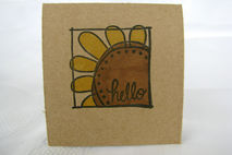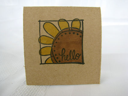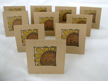 The cards measure approximately 3" X 3" when folded. The front features a stamped sunflower that has been hand colored. In the center of the flower is the sentiment "hello", making these cards possible to be used for any and all occasions.