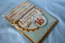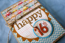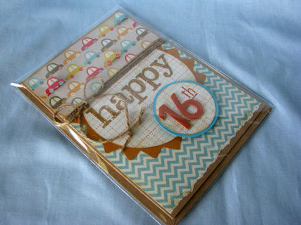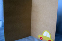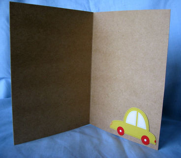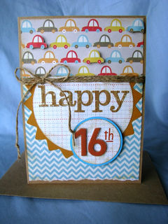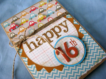 The card measures 5X7" and is layered with several fun papers. The top paper has fun cars and I hand cut a few out and layered them over the matching car with foam adhesive to make them pop. The circle with "16th" on it is also raised off the card with foam adhesive. The card is finished off with some twine, making it perfect for a masculine card or a feminine card. The inside has a little surprise. When opened you find a yellow car die cut in the lower right corner.