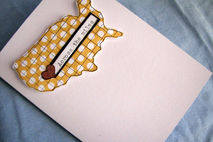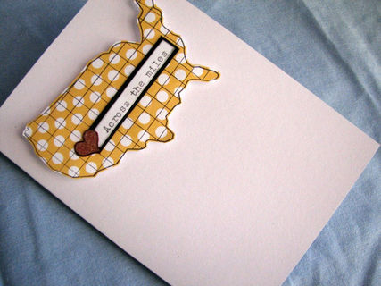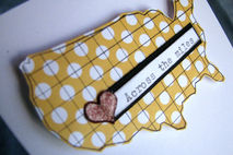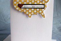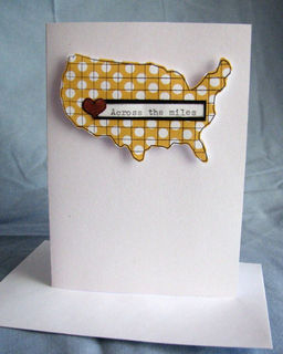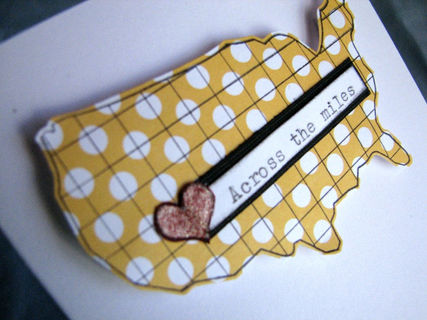 This 4X5.5" thinking of you card is perfect for letting someone know they are on your mind. This clean and simple card features the United States that has been stamped on a patterned paper and then hand cut out and adhered to the front with foam adhesive. The sentiment "across the miles" has been typed with the typewriter and matted before being placed, along with a heart, on top of the US. The heart has fine glitter added to it to make it shimmer and shine.