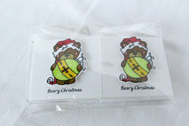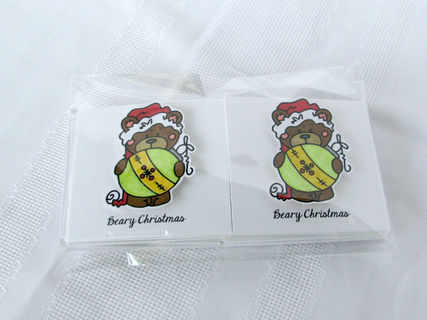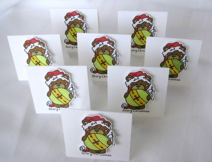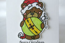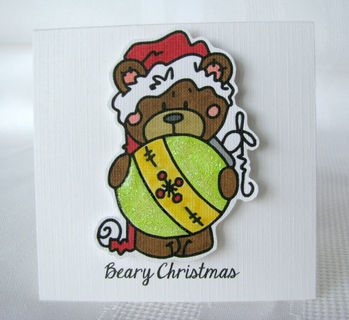 The front of the card has a digital image of a bear holding and ornament that has been hand colored and has glitter glue added to give the card some sparkle. Under the bottom of the bear is the sentiment "Beary" Christmas.