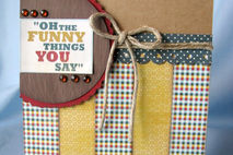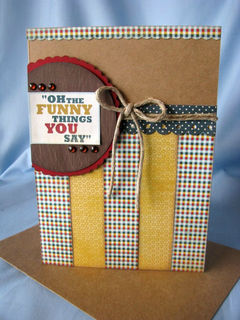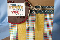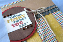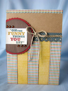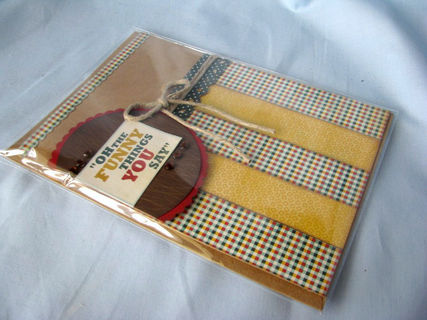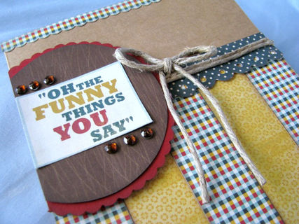 This 5"X7" card is perfect for any occasion. The colors and phrase make it perfect for male or females. The front is embellished with twine and rhinestones and has the phrase "Oh the funny things you say".