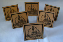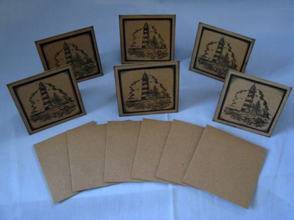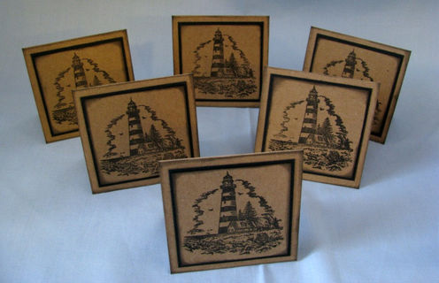 These kraft cards are clean and simple. They feature a stamped lighthouse which has been stamped on kraft cardstock and then matted on black cardstock. The edges are inked to make them pop even more.
