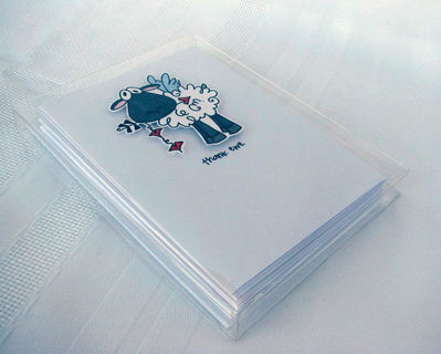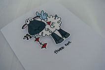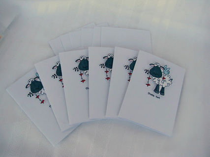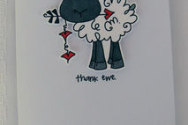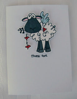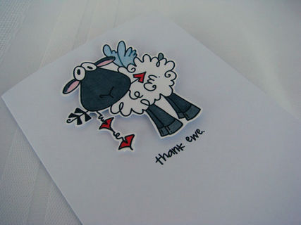 These "thank ewe" cards are perfect for any occasion you might need to give a thank you card. The front of the card has a "ewe" that has been hand colored and cut out after being printed on the paper. It is adhered to the card front with foam adhesive that gives it a little more dimension.