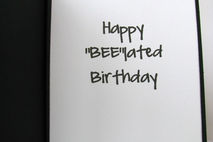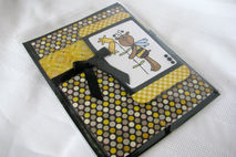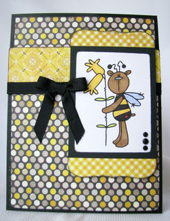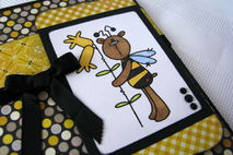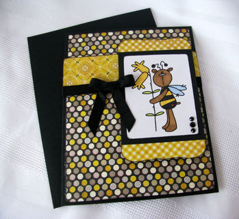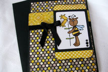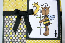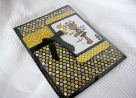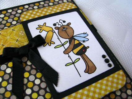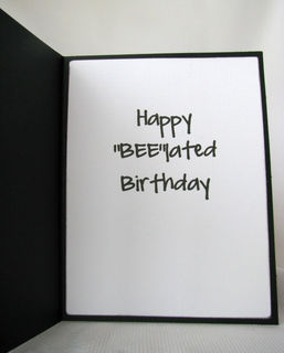 This 5X6.5" is perfect for that "bee"lated birthday card. The front has an image of a bear dressed as a bee that has been hand colored. The wings have glitter added to them to give them the sparkle that most wings have., The image is layered on gingham and polka dotted papers as well as a black ribbon/bow layered on the front of the card. The inside has the sentiment "Happy 'Bee'lated birthday" printed on a white mat. This makes it easier to sign because you don't have to have a special pen to write on the black card.