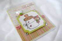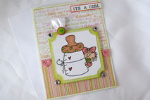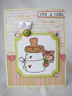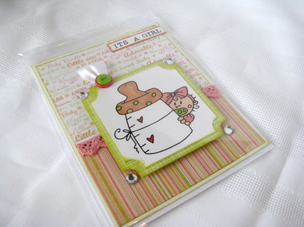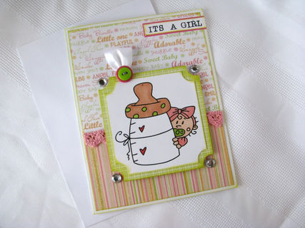 This 5X6.5" card is the perfect card to announce to someone special that you are having a baby girl. It's also perfect for a baby girl shower gift. The card has a sweet image of a baby girl peeking around a baby bottle. The image has been hand colored then matted on a green mat and layered on the card. In the corners of the mat are rhinestones. The top edge of the matted image is finished off with two buttons layered on top of each other then backed with a ribbon loop. The sentiment "Its a girl" is found in the upper right corner of the card.