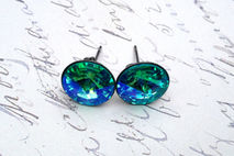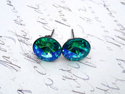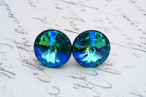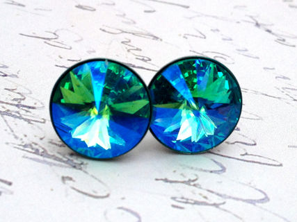 This pair of earrings feature absolutely gorgeous and unique Swaorvski crystals in a shade called turquoise glacier blue. They flash from turquoise to green with purple flashing. These are the 12mm size (just over 1/2 an inch in diameter) and are simple post back earrings with a lot of flash.