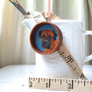 The pendant is 38mm in diameter (about 1.5 inches), half an inch deep, and is inset with an original miniature oil painting of your pet by me, Kathryn Barbosa. (Pictured pendant is an example) A sterling silver bail is attached to the mahogany wood pendant.