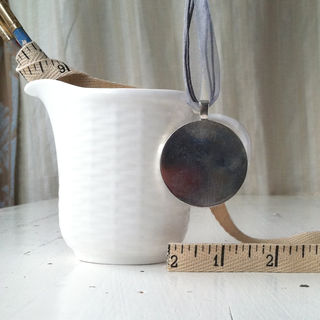 This circular pendant has a diameter of about 1.5 inches, or 40mm, and comes on a 16 -18 inch (includes 2 inch extention) Organza and Silk cord.