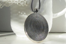 This oval pendant measures about 1.5 inches by 1 inch, and comes on a 16 -18 inch (includes 2 inch extension) Organza and Silk cord. I offer an optional 18 inch sterling silver chain as an ad-on for an additional $15.00.