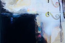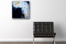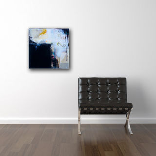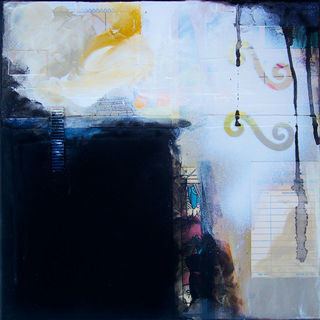 14" x 14" original mixed media collage painting on gallery wrapped canvas. The sides are painted black so there is no need for a frame unless desired. The first photo shows what it would look like hanging. The second photo is a close up of detail. There may be variations in color from monitors to real life! Main colors are sky blue, white and black with splash of pink and olive.