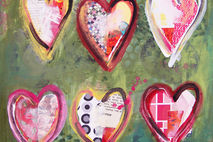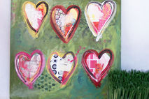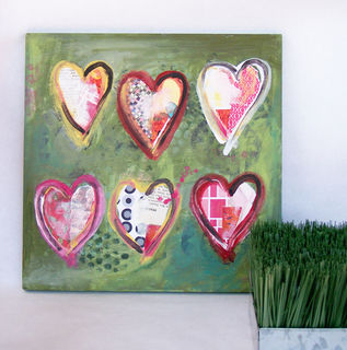 12" x 12" original mixed media collage painting on wood. The sides are painted green so there is no need for a frame unless desired. The second photo is a close up of detail. There may be variations in color from monitors to real life! Main colors are green, pink & red.