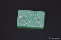 I want to ride my bicycle... I want to ride my bike! A silver bicycle perches atop a shimmery green background. The enchanting blend of lime, french lavender, lily and patchouli in this handcrafted glycerin soap will lift your spirits with its clean, refreshing fragrance.