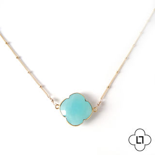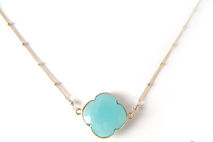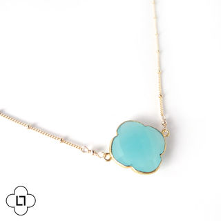 This turquoise blue quatrefoil is bezel set in 22k gold over silver and is suspended from a gold filled "dew drop" chain. I originally created this necklace for a bridesmaid set, but decided to open it up to the public. This necklace is a quality piece created with real chalcedony gemstones and a gold vermeil finish that is guaranteed to last for years. This necklace looks beautiful with a coral top or layered with a couple other necklaces!