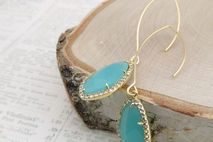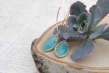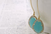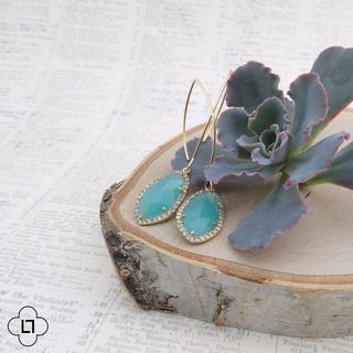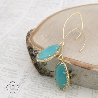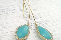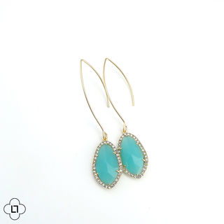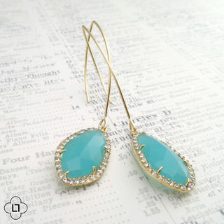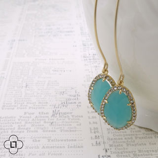 These long, open-hook gold earrings feature a gorgeous shade of turquoise glass beautifully framed in pave rhinestones. This piece is about as long as your pinkie finger. These make a beautiful bridesmaid gift and look especially fabulous paired with a white, navy or coral dress/top. I love a longer pair of earrings because they help lengthen my face - you won't be disappointed with these fresh, polished earrings!