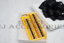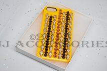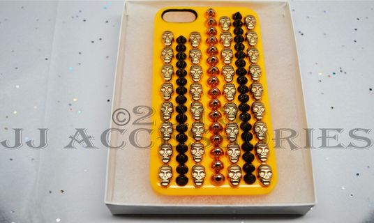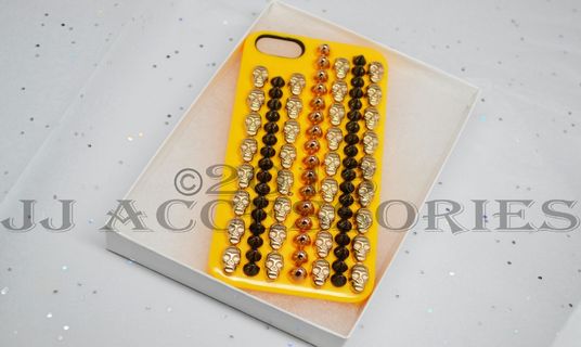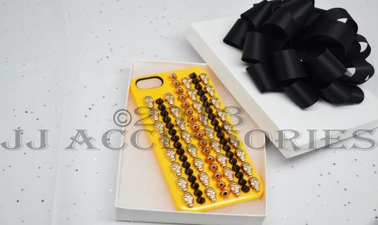 A very unique and appealing iphone 5 case, With every other row showcasing a line of skulls. The colors of the studs consist of a sheer gold, black, and a golden-peach. This ONE case is specified for the iphone 5/s. this item is also shipped in a gift box.