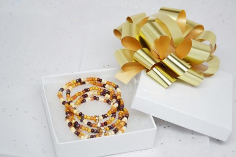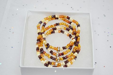 This set of bracelets consists of neutral toned beads, making a great pair with your daily outfits. The colors consist of cream, light brown, marble, and different shades of darker brown. This bracelet also has one golden 9mm roundel on four of the five individual bracelets. As shown in the picture, these bracelets are separate, but are sold as a complete set. This item is also shipped in a gift box.