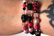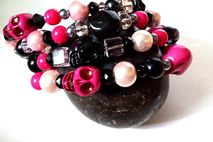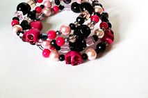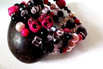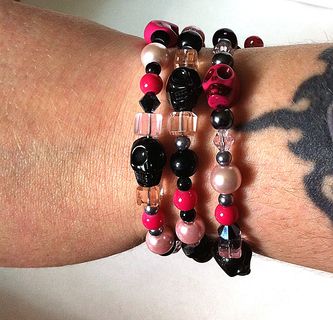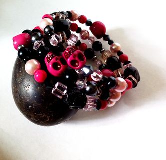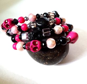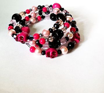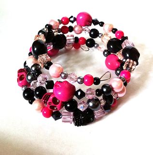I made this bracelet with lots of crystals, pearls, and acrylic beads in pink and black threaded on memory wire. It's adjustable so it will fit most wrists. Perfect as a layering or stackable bracelet! Wear it alone or with other bracelets. And it will always keep its shape! This bracelet has pink and black skull beads so it will be perfect for Day of the Dead or Dia de Los Muertos fans!!