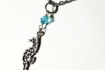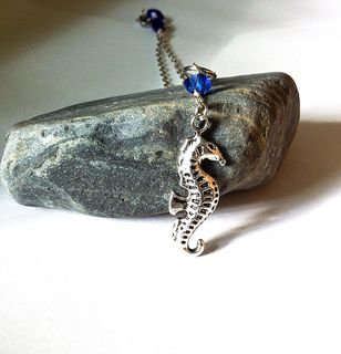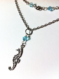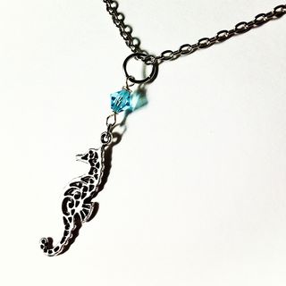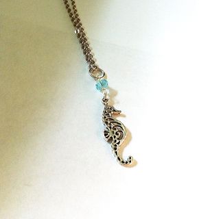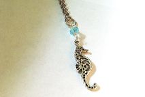 This cute necklace features a swirly silver seahorse that is 2" in length (including crystal) and 1cm wide, I've added a light blue Swarovski crystal and two at the clasp. It has a 25" silver tone chain. Perfect for any age!! Someone who loves ocean life or beach themes will adore this necklace!!