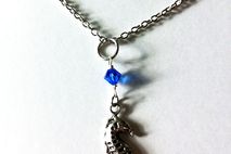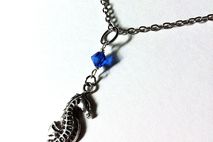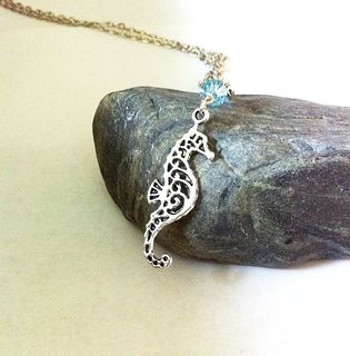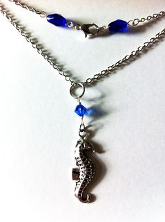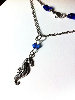 This cute seahorse necklace is perfect for a girl that loves the beach, nautical and of course seahorses !! It's simple and cute. I've added a blue Swarovski crystal to the pendant (which is 1 3/4" in length and 1cm wide) and added two more cobalt crystal beads by the clasp. I've put it on a 22" silver tone chain. ** the last photo is another example of a different style seahorse necklace but sold separately.