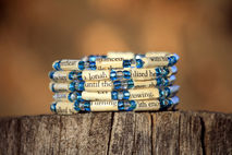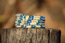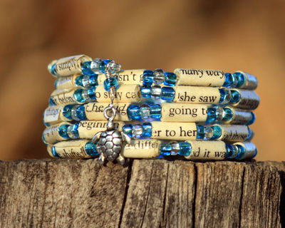 This beaded bracelet was made using alternating paper beads and teal and clear glass beads. The paper beads were created using pages from the book, The Last Song, by Nicholas Sparks. The bracelet is completed with the dangling turtle charm. The beads were strung on to memory wire and is so easy to wrap on to your wrist. The paper beads were handmade and are protected with a polyurethane coating so they won't transfer ink and are water resistant (don't shower or swim while wearing the bracelet, though!). Wonderful gift for the book lover in your life. The two modeled photos represent how the bracelet will look. * There may be some color and/or text variation from the photo *