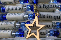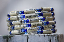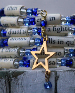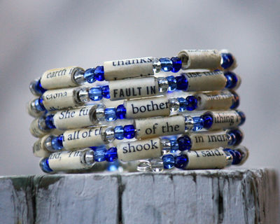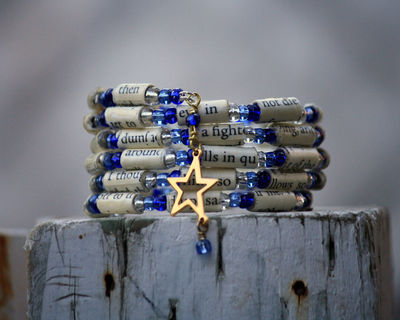 This pretty beaded bracelet was made using alternating paper beads and shades of blue and clear silver glass beads. The paper beads were created using pages from the book, The Fault in Our Stars. The bracelet is completed with the dangling gold toned star charm. The beads were strung on to memory wire and is so easy to wrap on to your wrist. The paper beads were handmade and are protected with a polyurethane coating so they won't transfer ink and are water resistant (don't shower or swim while wearing the bracelet, though!). Wonderful gift for the book lover in your life. The two modeled photos represent how the bracelet will look. * There may be some color and/or text variation from the photo *