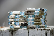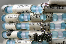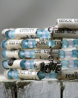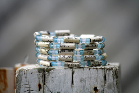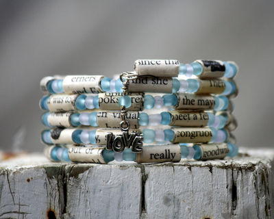 This beaded bracelet was made using alternating paper beads and frosted teal and white glass beads. The paper beads were created using pages from the book, Eat, Pray, Love. The bracelet is completed with the dangling Love charm. The beads were strung on to memory wire and is so easy to wrap on to your wrist. The paper beads were handmade and are protected with a polyurethane coating so they won't transfer ink and are water resistant (don't shower or swim while wearing the bracelet, though!). Wonderful gift for the book lover in your life. The two modeled photos represent how the bracelet will look. * There may be some color and/or text variation from the photo *