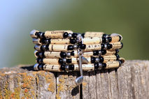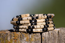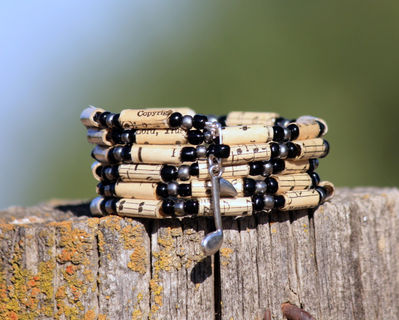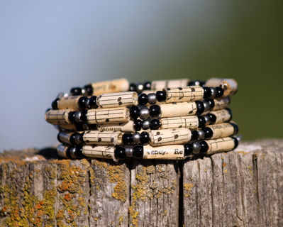This pretty bracelet features beads created from pages of a vintage hymnal and is completed with a pretty music charm. The glass beads alternate between black and a silver color. The paper beads are protected with two coats of polyurethane spray so they won't transfer ink and are water resistant (don't shower or swim while wearing the bracelet, though!). Your actual bracelet may vary from the one in the photo.