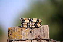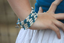 One size fits all. Handmade using paper beads, glass beads, and memory wire.