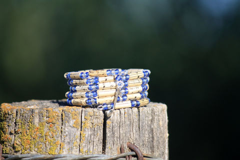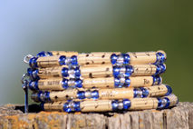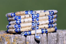 One size fits all. Handmade using paper beads, glass beads, and memory wire.