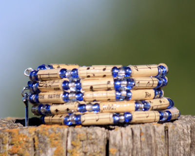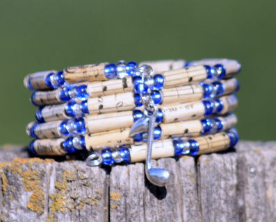 This pretty bracelet features beads created from pages of a vintage hymnal and is completed with a pretty music charm. The glass beads are two shades of blue and they catch the light so nicely. The paper beads are protected with two coats of polyurethane spray so they won't transfer ink and are water resistant (don't shower or swim while wearing the bracelet, though!). Your actual bracelet may vary from the one in the photo.