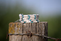 One size fits all. Handmade using paper beads, glass beads, and memory wire.