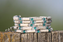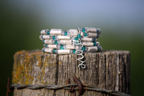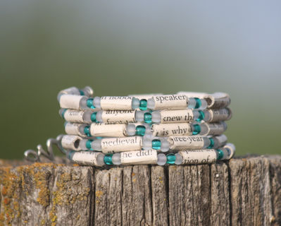 This beaded bracelet was made using alternating paper beads and teal and white glass beads. The paper beads were created using pages from the book, Eat, Pray, Love. The bracelet is completed with the dangling Love charm. The beads were strung on to memory wire and is so easy to wrap on to your wrist. The paper beads were handmade and are protected with a polyurethane coating so they won't transfer ink and are water resistant (don't shower or swim while wearing the bracelet, though!). Wonderful gift for the book lover in your life. The two modeled photos represent how the bracelet will look. * There may be some color and/or text variation from the photo *