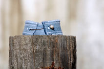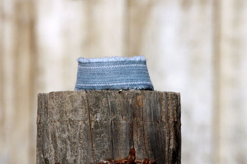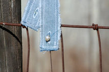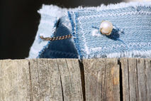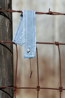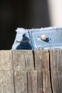 What do you do with a cuff link which has lost it's mate? This cute denim cuff is the perfect solution! This denim cuff with two button holes comes with its own vintage pearl and gold (unknown if real or faux) single cuff link. One of a kind.