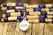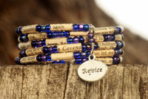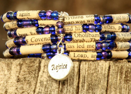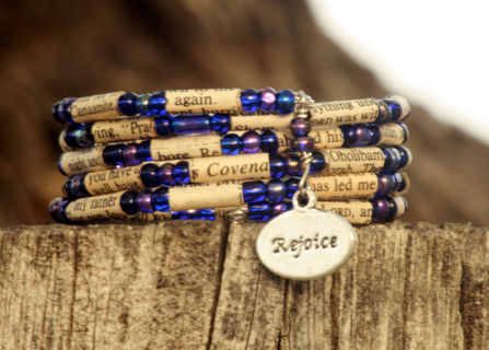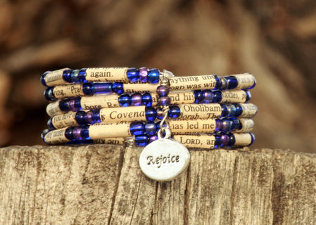 This handmade beaded faith bracelet was made using alternating paper beads and blue glass beads. The paper beads were created using pages from the Bible. The pretty metal charm is an excellent reminder to "rejoice". The beads were strung on to memory wire and is so easy to wrap on to your wrist. The paper beads are protected with two coats of polyurethane spray so they won't transfer ink and are water resistant (don't shower or swim while wearing the bracelet, though!). Display your faith with this pretty conversation starter. Wonderful gift for milestone celebrations, such as Confirmation! The two modeled photos represent how the bracelet will look. * There may be some color and/or text variation from the photo *