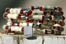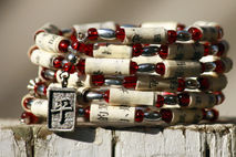This Asian inspired bracelet was created using beads upcycled from a Chinese language book. The beads were strung with alternating red glass beads and silver toned beads. Completing the bracelet is a silver colored charm with the Chinese character for Peace stamped on one side and Peace written in English on the other side. The beads were strung on to memory wire for ease of wear. The handmade paper beads were coated with gloss urethane varnish, making them water resistant. They are not guaranteed to be waterproof, so no swimming or showering while wearing the bracelet.