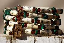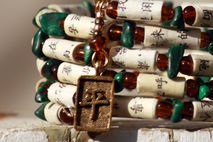 This Asian inspired bracelet was created using beads upcycled from a Chinese language book. The beads were strung with alternating tortoise glass beads and dark green malachite chip beads. Completing the bracelet is a gold colored charm with the Chinese character for Peace stamped on one side and Peace written in English on the other side. The beads were strung on to memory wire for ease of wear. The handmade paper beads were coated with gloss urethane varnish, making them water resistant. They are not guaranteed to be waterproof, so no swimming or showering while wearing the bracelet.