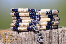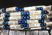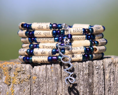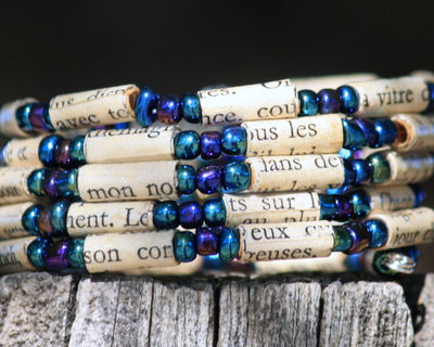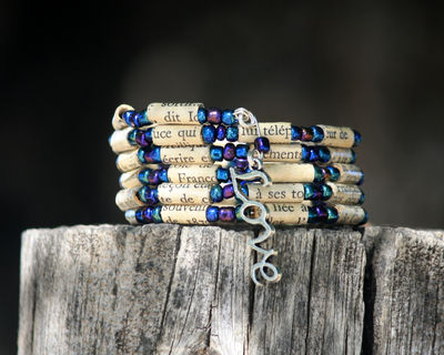 These paper beads were created using pages from the book, Siegfried et le Limousin, by Jean Giraudoux in 1922. The paper beads are strung on to memory wire with alternating "peacock" colored glass beads. The bracelet is completed with a dangling charm that spells Love. The memory wire makes the bracelet so easy to wrap on to your wrist and it stays without a clasp or closure. The paper beads were handmade and are protected with a polyurethane coating so they won't transfer ink and are water resistant (don't shower or swim while wearing the bracelet, though!). Wonderful gift for the book lover or francophile in your life. The two modeled photos represent how the bracelet will look.* There may be some color variation from the photo *
