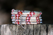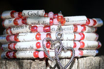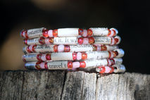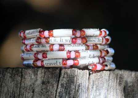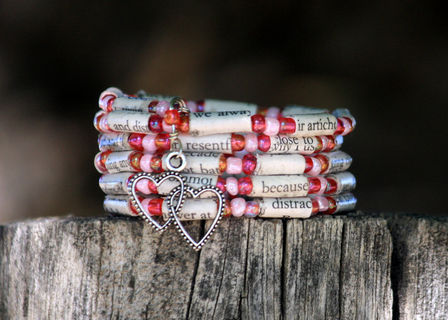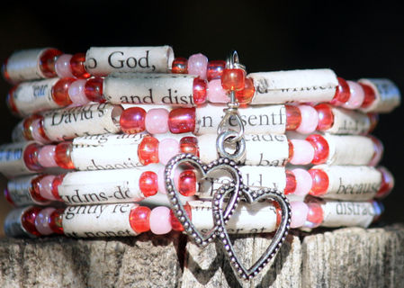 This beaded bracelet was made using alternating paper beads and pink glass beads. The paper beads were created using pages from the book, Eat, Pray, Love. The bracelet is completed with the dangling double heart charm. The beads were strung on to memory wire and is so easy to wrap on to your wrist. The paper beads were handmade and are protected with a polyurethane coating so they won't transfer ink and are water resistant (don't shower or swim while wearing the bracelet, though!). Wonderful gift for the book lover in your life. The two modeled photos represent how the bracelet will look. * There may be some color and/or text variation from the photo *
