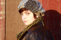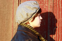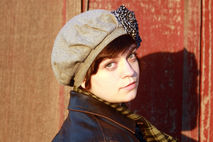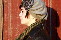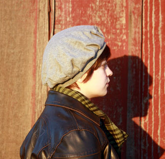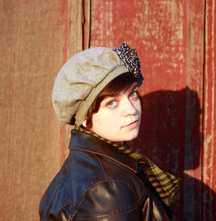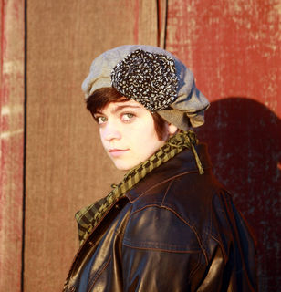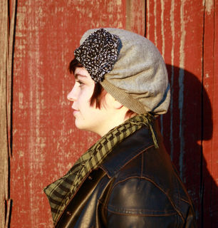 This sweet, romantic beret is 98% cotton and 2% cashmere and began life as a cozy men's sweater. The gray color is calm and neutral and the scrappy black rayon flower has sweet musical notes in the print. This hat is very slouchy and comfortable with lots of stretch in the band. Rest assured that as you keep your head warm in romantic, vintage style, you are keeping your carbon footprint to a minimum with this upcycled beret.