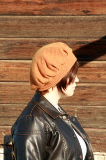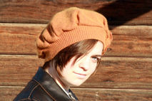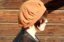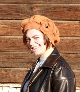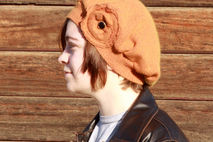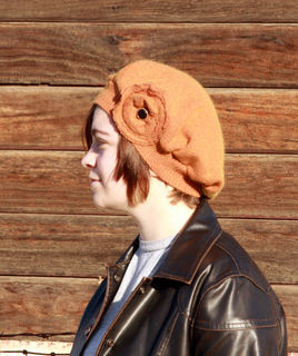 This romantic, vintage inspired hat was created from a discarded sweater. This rust orange hat is a luxurious blend of cotton, angora and cashmere, soft, warm and beautiful. Upon close inspection, there appears to be red thread in the weave and the best surprise? It has a green irridescense in direct sunlight! The same color scrappy flower is adorned with a vintage button and adds the perfect amount of feminine charm to the hat. Rest assured that as you keep your head warm in romantic, vintage style, you are keeping your carbon footprint to a minimum with this upcycled beret. One of a kind. 72% cotton, 15% angora and 13% cashmere.