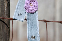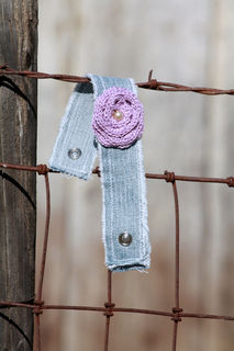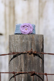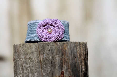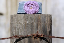 Here is a pretty, upcycled denim cuff with a snap closure. Features a lavender, crocheted rose in cotton, hand sewn directly to the cuff. Adorning the rose is a faux pearl, reclaimed from a vintage necklace. Cuff is created from two layers of hand frayed denim, sewn together. Measures 8 inches closed, 9 inches total, 1 inch wide.