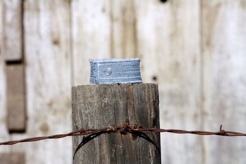 Cuff is created from two layers of hand frayed denim, sewn together. Measures 8 inches closed, 9 inches total, 1 inch wide.