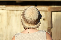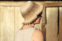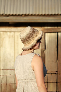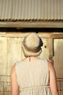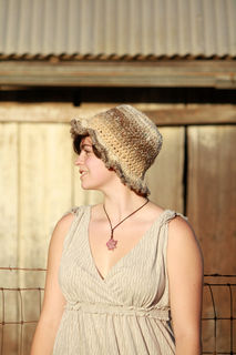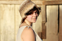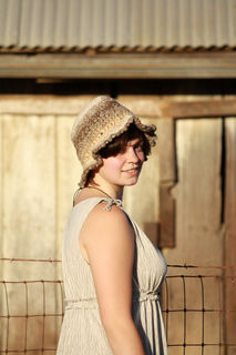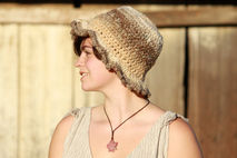 This cute Downton Abbey inspired cloche was hand crocheted using reclaimed yarn unraveled from a sweater. The ombre yarn is off-white, tan and brown with flecks of teal and red. This cloche has a sweet ruffled brim reminiscent of 1920s Edwardian style. One size fits all. One of a kind.