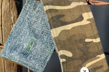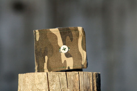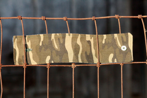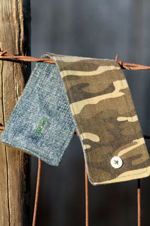 This upcycled cuff is as cool as they get! Camo on the front and denim on the back side, it was sewn together then top stitched for style and durability. Perfect gift for a military parent or sibling. Also good for the hunter in your life. Unisex style makes this one good for everyone. Made from reclaimed jeans and camo pants and closes with a reclaimed button.